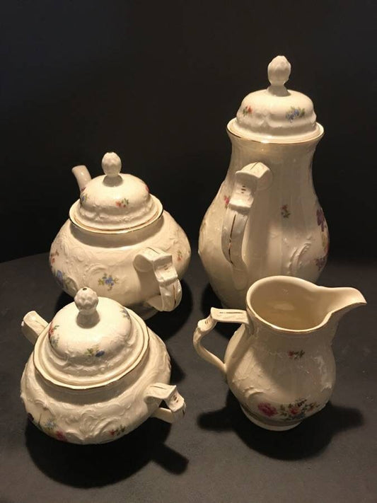This vintage Rosenthal "Sans Souci" Pattern German Fine Porcelain China tea and coffee service includes: 11 Teacups & 12 Saucers Tea & Coffee Service: Teapot, Coffeepot, and Sugar Bowl, all...